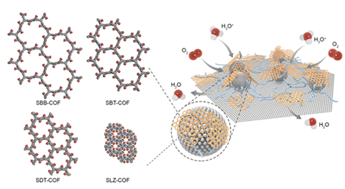 针对这一挑战,该研究提出并构筑了适用于燃料电池催化层的多孔共价有机框架(COF)离聚物,改善气固液三相界面中的传质问题,突破了传统链状离聚物的束缚,显著提高了催化层的传质效率,大幅提高燃料电池的功率密度。如图所示,该二维聚合物平面结构由六边形骨架在二维方向上无限周期性延展而成,六边形骨架内部锚定了磺酸基悬臂提供高的质子传导能力,COF孔道能够为氧气和水提供通路。采用多孔COF离聚物使得商用Pt/C催化剂的质量活性和燃料电池的峰值功率密度均提高了1.6倍。